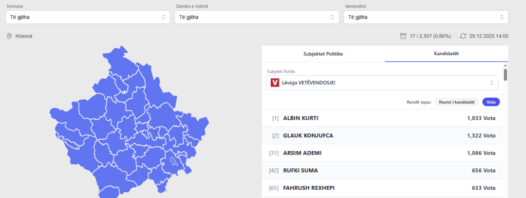 Derisa janë numruar veç 17 kuti apo 0.66%, në listën e vetëvendosjes po prin kryetari i partisë Albin Kurti me 1 mijë e 883 vota, pas tij Glauk Konjufca me 1 mijë e 322 vota, i treti Arsim Ademi me 1 mijë e 86, Rufki Suma me 656 vota dhe Fahrush Rexhepi me 633.