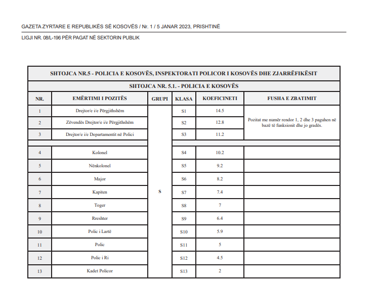 Hyni Mirë se vini! Hyni në llogarinë tuaj Emri i përdoruesit tuaj fjalëkalimi juaj Forgot your password? Get help Krijo nje llogari Krijo nje llogari Mirëpritur! regjistrohuni për një llogari emaili juaj Emri i përdoruesit tuaj Një fjalëkalim do t'ju dërgohet në email Shërim fjalëkalimin Rikupero fjalëkalimin emaili juaj Një fjalëkalim do t'ju dërgohet në email LAJME Këta janë koeficientët për Policinë e Kosovës në Ligjin e Pagave 5 Janar, 2023 - 23:02 5 Janar, 2023 - 23:02 By MitrovicaSot Shpërndaje FacebookTwitterPinterestWhatsApp Sot në Gazetën Zyrtare është publikuar përmbajtja e Ligjit të Pagave. Ndonëse s’dihet vlera, janë bërë të ditur koeficientët. Përveç për funksionarë shtetërorë, koeficentët janë bërë të ditur edhe për policët si dhe kategoritë tjera. Tabela: Shpërndaje FacebookTwitterPinterestWhatsApp TË FUNDIT Sadiku: LDK i kishte 15 vota të gatshme për Osmanin, por s’u paraqit si kandidate MitrovicaSot - 8 Prill, 2026 - 22:23 Paradite me diell, më vonë vranësira – ja si parashihet moti të enjten MitrovicaSot - 8 Prill, 2026 - 21:54 “Kurti njihet për eliminim”-Haradinaj ia përmend Kurtit të larguarit nga VV: I erdhi radha Osmanit MitrovicaSot - 8 Prill, 2026 - 20:58 Gruaja e Pozharit në mesin gjashtë kandidatëve për Kushtetuese MitrovicaSot - 8 Prill, 2026 - 19:41 TË FUNDIT Sadiku: LDK i kishte 15 vota të gatshme për Osmanin, por s’u paraqit si kandidate 8 Prill, 2026 - 22:23 Paradite me diell, më vonë vranësira – ja si parashihet moti të enjten 8 Prill, 2026 - 21:54 “Kurti njihet për eliminim”-Haradinaj ia përmend Kurtit të larguarit nga VV: I erdhi radha Osmanit 8 Prill, 2026 - 20:58 Gruaja e Pozharit në mesin gjashtë kandidatëve për Kushtetuese 8 Prill, 2026 - 19:41