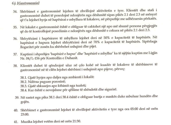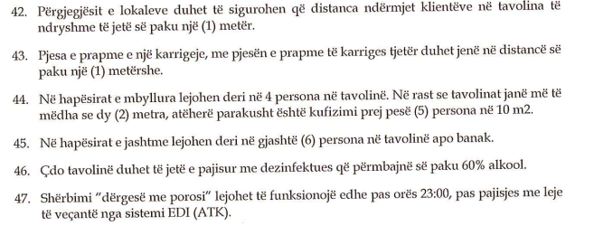Distanca mes tavolinave nëpër lokale duhet të jetë 1 metër, në hapësirat e mbyllura lejohen të ulën katër persona në tavolinë, kurse në hapësirat e hapura deri gjashtë persona.