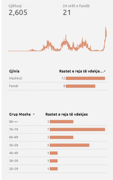 21 persona të infektuar me koronavirus kanë vdekur në 24 orët e fundit. 12 prej viktimave janë burra dhe 9 gra. Ministria e Shëndetësisë ka treguar edhe se të çfarë grumposhash janë viktimat.
