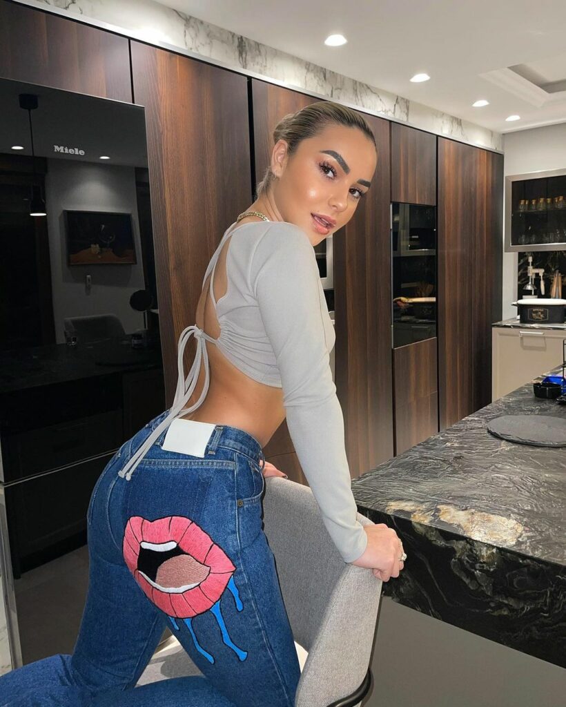 Veshur me xhinse me një dizajn plot stil në kombinim me një bluzë bezhë, këngëtarja ka pozuar e lumtur.