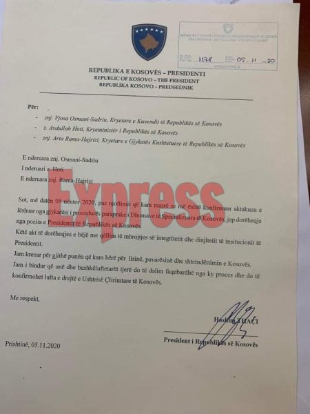 Ish-presidenti i Kosovës, Hashim Thaçi, përmes një letre zyrtare më 5 nëntor kishte njoftuar për dorëheqjen e tij, kryetaren e Kuvendit, Vjosa Osmanin, kryeministrin e Kosovës, Avdullah Hotin dhe kryetaren e Kushtetueses, Arta-Rama Hajrizin.