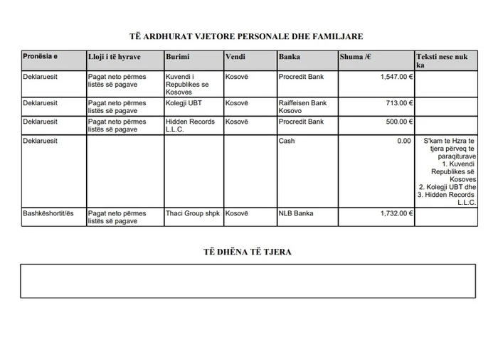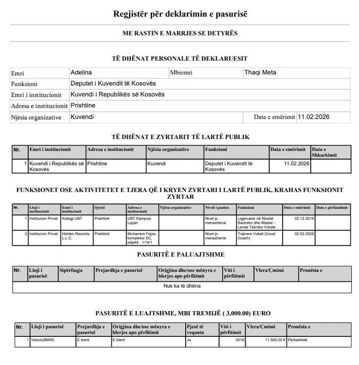 Deputetja e Kuvendit, Adelina Thaçi Meta, më 11 mars 2026 ka dorëzuar formularin e deklarimit të pasurisë.