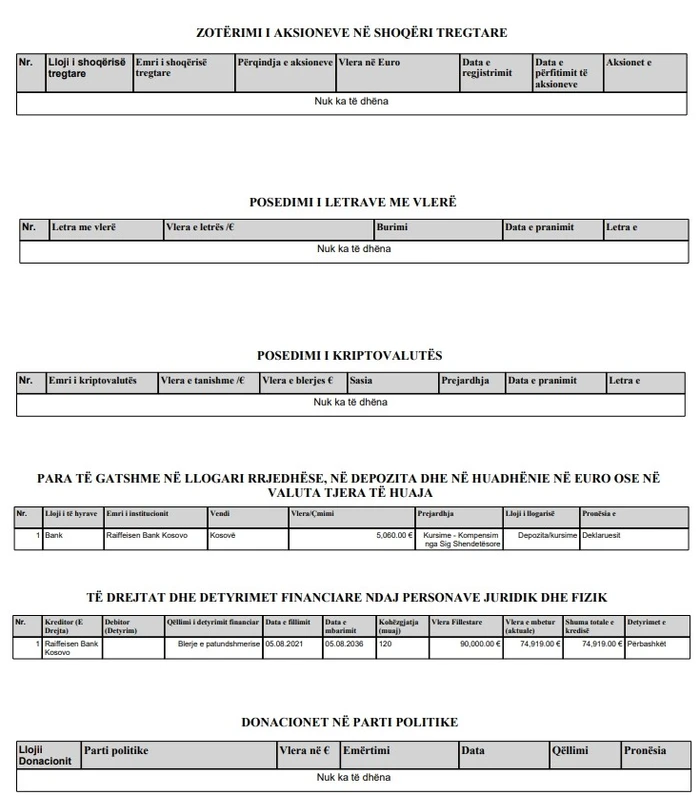 Në pjesën e detyrimeve financiare, ajo ka deklaruar kredi në për blerje të patundshmërisë, me datë fillimi 05.08.2021 dhe afat mbarimi 05.08.2036 (120 muaj). Vlera fillestare e kredisë është 90,000 euro, ndërsa vlera e mbetur figuron 74,919 euro, me pronësi të shënuar të përbashkët.