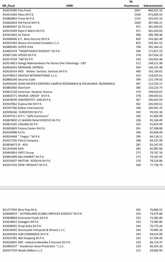 Ndryshe sot ministri i Financave, Hekuran Murati, ka publikuar listën e 50 bizneseve fituese, të cilët përfituan 60 milionë euro nga shteti si ndihmë për ta tejkaluar goditjen ekonomike të pësuar nga pandemia COVID-19.