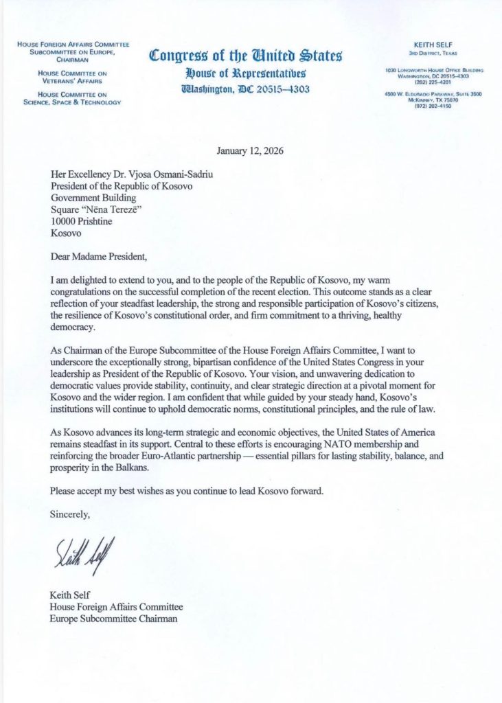 “Dua të nënvizoj besimin jashtëzakonisht të fortë dhe bipartizan të Kongresit të Shteteve të Bashkuara në udhëheqjen tuaj si Presidente e Republikës së Kosovës”, ka shkruar Kongresisti Self në letrën mbështetëse.