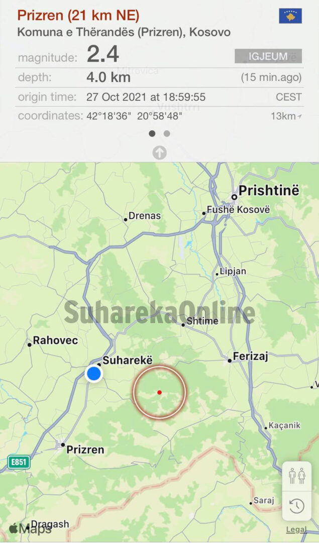 Tërmet me magnitudë 2.4 shkallë të Rihterit, ka goditur në jug-lindje të Suharekës, në Kosovë, rreth orës 18:59.