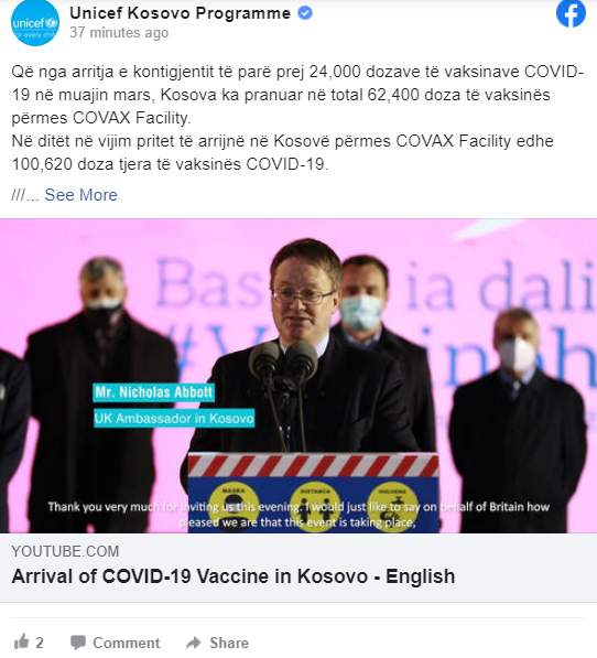 Që nga arritja e kontigjentit të parë prej 24,000 dozave të vaksinave COVID-19 në muajin mars, Kosova ka pranuar në total 62,400 doza të vaksinës përmes COVAX Facility.