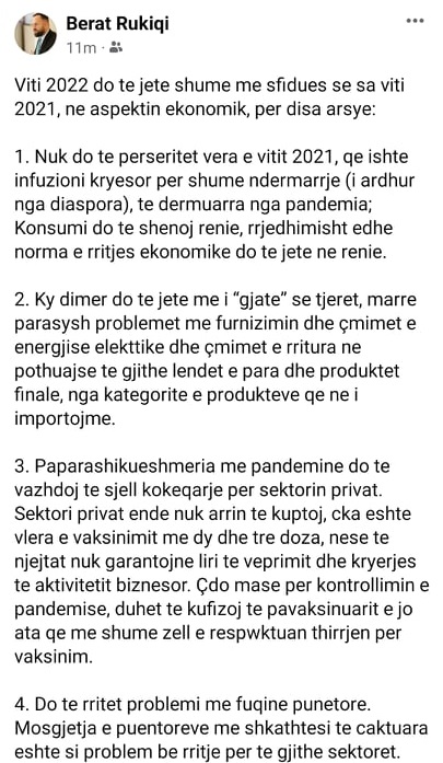 3. Paparashikueshmeria me pandemine do te vazhdoj te sjell kokeqarje per sektorin privat. Sektori privat ende nuk arrin te kuptoj, cka eshte vlera e vaksinimit me dy dhe tre doza, nese te njejtat nuk garantojne liri te veprimit dhe kryerjes te aktivitetit biznesor. Çdo mase per kontrollimin e pandemise, duhet te kufizoj te pavaksinuarit e jo ata qe me shume zell e respëktuan thirrjen per vaksinim.