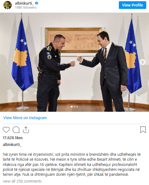 “Në zyren time në Kryeministri, sot prita ministrin e brendshëm dhe udhëheqës të lartë të Policisë së Kosovës. Në mesin e tyre ishte edhe Besart Ahmeti, të cilin e ritakova nga afër pas 16 vjetëve. Kapiteni Ahmeti ka udhëhequr profesionalisht policë të njësisë speciale në Bërnjak dhe ka zhvilluar shkëlqyeshëm negociata në terren atje. Nuk ia shtrënguam dorën njëri-tjetrit, për shkak të pandemisë”, ka shkruar Kurti.