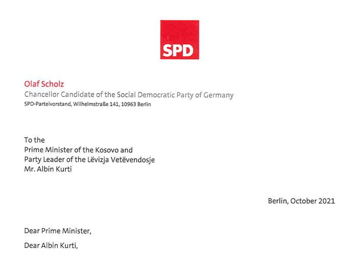 “Ju falënderoj për letrën dhe dëshirat e mira. Tashmë kemi lënë pas fushatën ngazëllyese zgjedhore. Partia Socialdemokrate e Gjermanisë doli nga zgjedhjet për Bundestagun si partia më e fortë dhe ka ambicien për të udhëhequr me qeverinë e re federale”, ka shkruar ai.