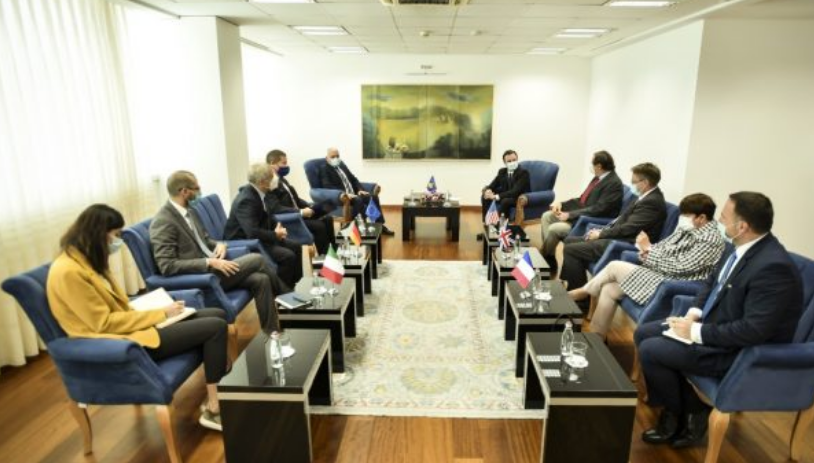 “Kryeministri i Republikës së Kosovës, z. Albin Kurti, së bashku me Ministrin e Punëve të Brendshme, z. Xhelal Sveçla, priti në takim ambasadorët e vendeve të Quint-it dhe shefin e Zyrës së Bashkimit Evropian në Kosovë: të ngarkuarin me punë në ambasadën e Shteteve të Bashkuara të Amerikës, z. Nicholas Giacobbe, ambasadorin e Gjermanisë, z. Joern Rohde, ambasadorin e Mbretërisë së Bashkuar, z. Nicholas Abbott, ambasadoren e Francës, znj. Marie-Christine Butel, zëvendës-shefin e Misionit të Italisë në Kosovë, z. Ugo Ferrero, dhe Përfaqësuesin e Posaçëm e Shefin e Misionit të Bashkimit Evropian në Kosovë, z. Tomas Szunyog”, thuhet në njoftimin e Kryeministrisë.