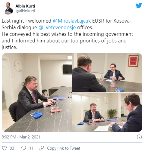 Kryetari i VV’së, Albin Kurti, ka shpalosur disa detaje rreth takimit të tij me të Dërguarin Special të BE’së për Dialogun Kosovë-Serbi, Mirosllav Lajcak.