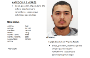 Policia po kërkon ndihmë për arrestimin e 21-vjeçarit, meqenëse është i kërkuar për veprën penale ““Blerje, posedim, shpërndarje dhe shitje e paautorizuar e narkotikeve, substancave psikotrope apo analoge”.