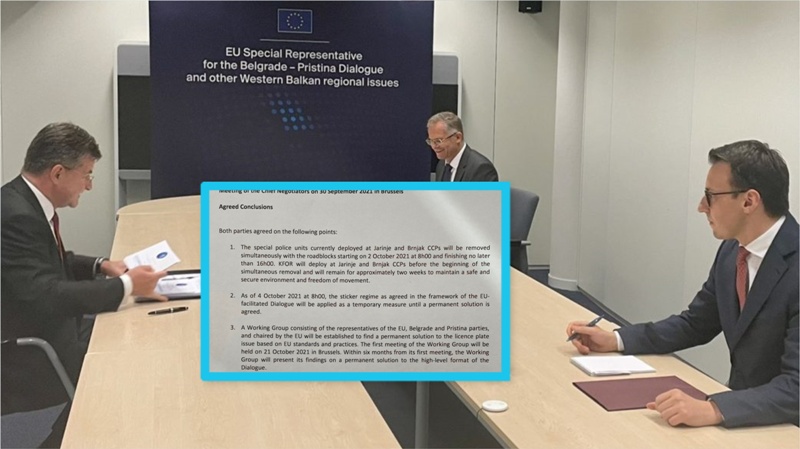3. Një Grup Punues i përbërë nga përfaqësues të palëve të BE -së, Beogradit dhe Prishtinës, dhe i kryesuar nga BE do të caktohet për të gjetur një zgjidhje të përhershme për çështjen e tabelave të regjistrimit, bazuar në standardet dhe praktikat e BE -së. Takimi i parë i Grupit të Punës do të mbahet më 21 tetor 2021 në Bruksel. Brenda gjashtë muajve nga takimi i tij i parë, Grupi Punues do të paraqesë gjetjet e tij mbi një zgjidhje të përhershme të formatit të nivelit të lartë të Dialogut.”, thuhet në dokument.