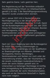 Ata që ishin në pritje për tu pajisur me viza pune tani po marrin e-mail/ njoftim nga ambasada gjermane se termini i tyre është anuluar për disa arsyeje.