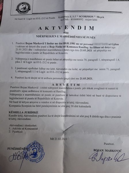 Aktvendimi për ndërprerjen e marrëdhënies së punës të Bojan Markoviqit.