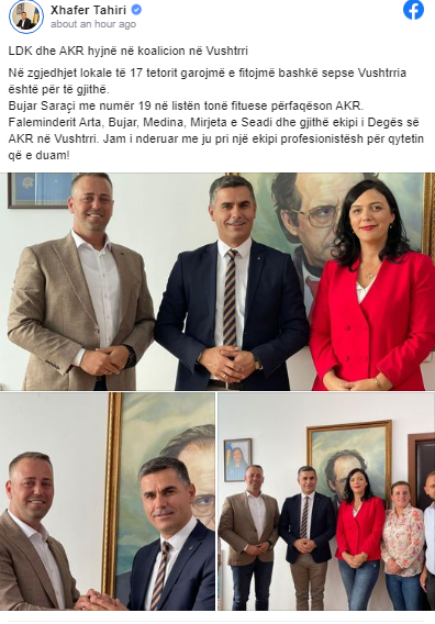 “LDK dhe AKR hyjnë në koalicion në Vushtrri. Në zgjedhjet lokale të 17 tetorit garojmë e fitojmë bashkë sepse Vushtrria është për të gjithë. Bujar Saraçi me numër 19 në listën tonë fituese përfaqëson AKR. Faleminderit Arta, Bujar, Medina, Mirjeta e Seadi dhe gjithë ekipi i Degës së AKR në Vushtrri. Jam i nderuar me ju pri një ekipi profesionistësh për qytetin që e duam”, ka shkruar Tahiri.