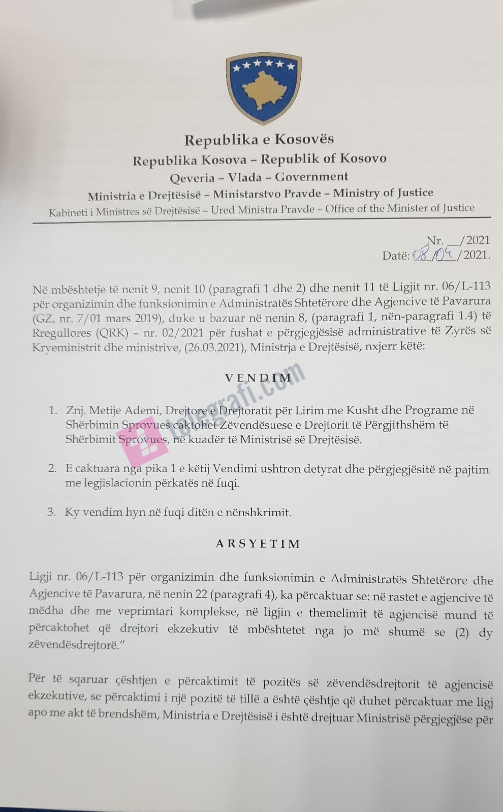 Zonja Metije Ademi, drejtore e Drejtoratit për lirim me kusht dhe programe në Shërbimin sprovues caktohet zëvendësuese e Drejtorit të përgjithshëm të Shërbimit sprovues në kuadër të Ministrisë së Drejtësisë”.