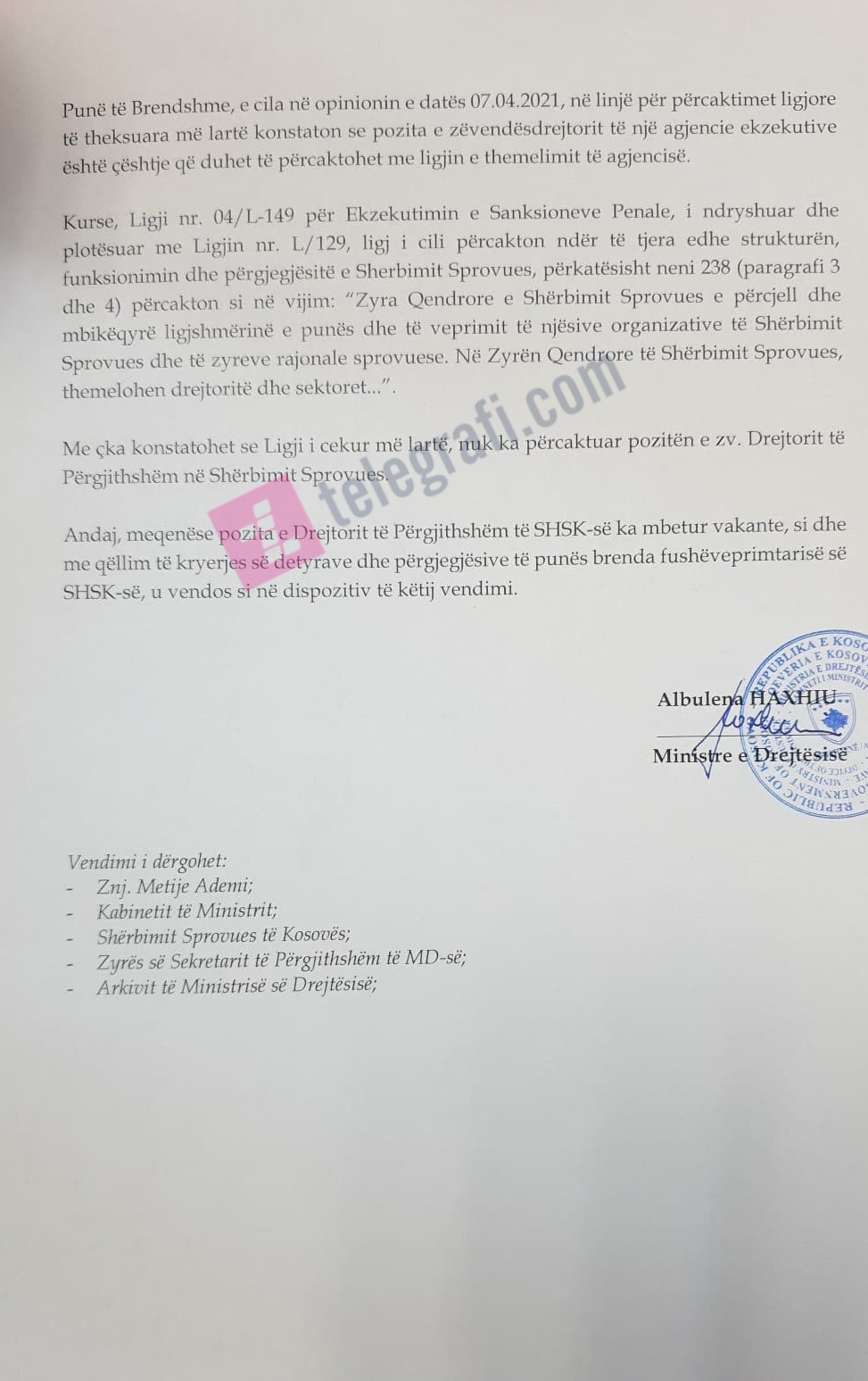 Në vendimin të cilin e ka siguruar Telegrafi, shkruan se ky vendim është marr në bazë të kompetencave që ka ministrja Haxhiu.