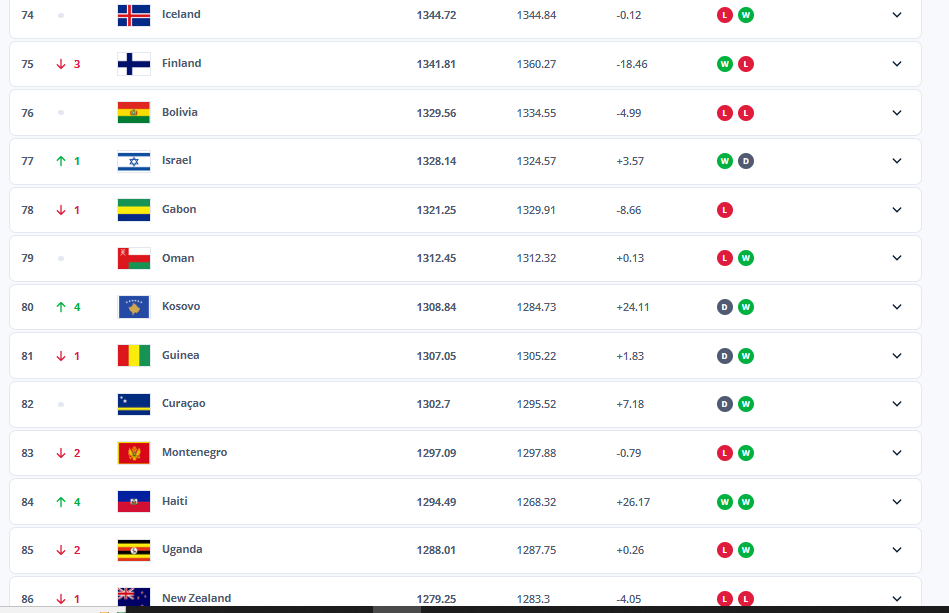 Sipas kësaj liste, Kombëtarja e Kosovës renditen në vendin e 80-të në botë, duke u ngjitur për katër vende më lartë, në krahasim me listën paraprake.