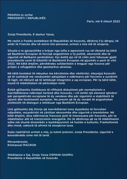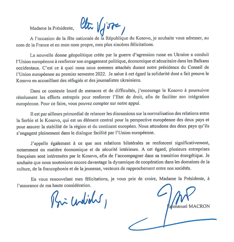 Në letrën e tij, Macron ka thënë se Kosova ka përkrahjen e plotë franceze në forcimin e sundimit të ligjit, ndërsa ka bërë thirrje që t’i kushtohet rëndësi rifillimit të diskutimeve në kuadër të dialogut Kosovë-Serbi të lehtsuar nga BE-ja.