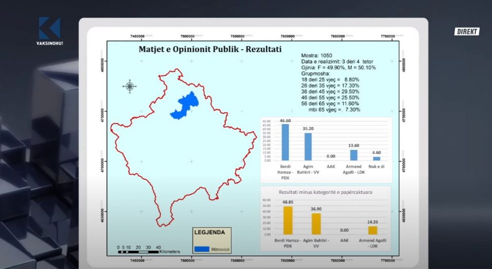 Rezultatet e këtij sondazhi kur hiqen kategoritë e papërcaktuara dhe shpërndahet vota e tyre: Bedri Hamza (PDK) 48,85 përqind, Agim Bahtiri (VV) 36.9 përqind, Armend Agolli (LDK) 14.26 përqind.