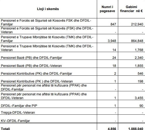 “Bazuar në krahasimin e të dhënave të Ministrisë për skemat pensionale dhe sociale kemi identifikuar se Ministria kishte kryer pagesa në vlerë 1,088,040 euro për përfitues të cilët gëzojnë më shumë se një pension. Rastet më të shpeshta të përfitimit të më shumë se një pensioni nga skemat pensionale, janë përfituesit që i takojnë kategorisë së TMK-së dhe FSK-së, të cilat pagesa Ministria kishte kryer edhe vitin e kaluar bazuar në vendimin e ish Kryeministrit nr. 12/82 të datës 28.12.2018. Me këtë vendim ishte aprovuar vazhdimi i pagesave të pensioneve të dyfishta për FSK dhe ish-pjesëtarët e TMK-së deri në interpretimin përfundimtar të ligjeve për skemat pensionale. Krahasuar në vitin e kaluar, ka një rritje të lehtë të shumës së këtyre pagesave”, thuhet në raportin e ZKA-së për pasqyrat finaciare të MPMS-së.