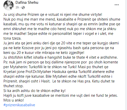 “Nuk po muj me marr me mend, kasabalite e Prizrenit qe shiteni shume kasabali, mu qu me votu ni katunar si shaqiri qe as emrin (edhe pse qe emri shkruhet me te madhe cdo here) nuk po me shkon me ja shkru me te madhe! Sepse eshte ni personalitet teper i vogel e i ulet, me tona tzeza”, ka shkruar aktivistja e VV’së.