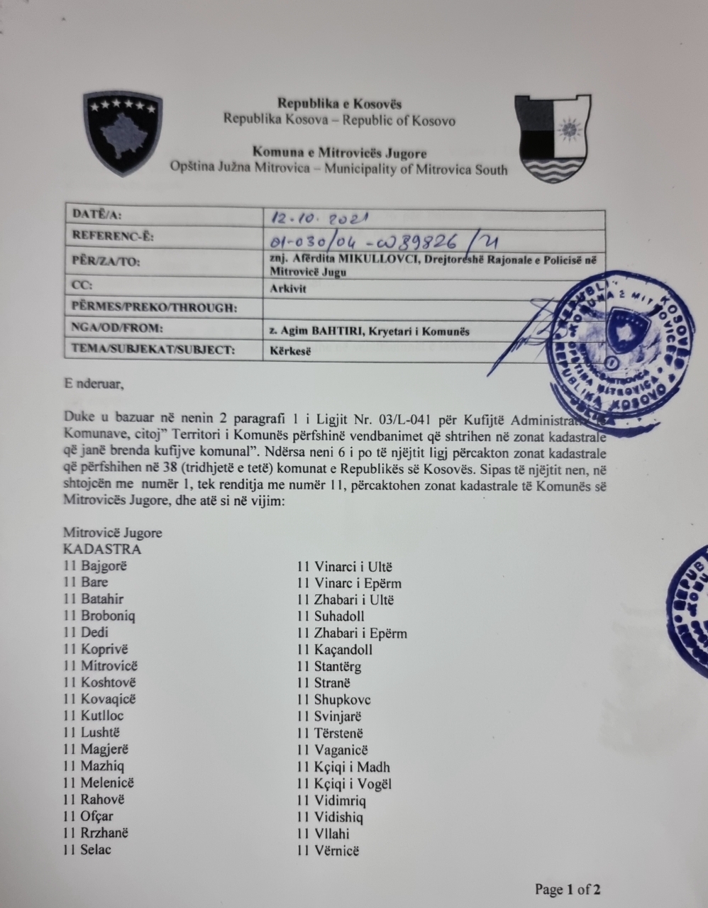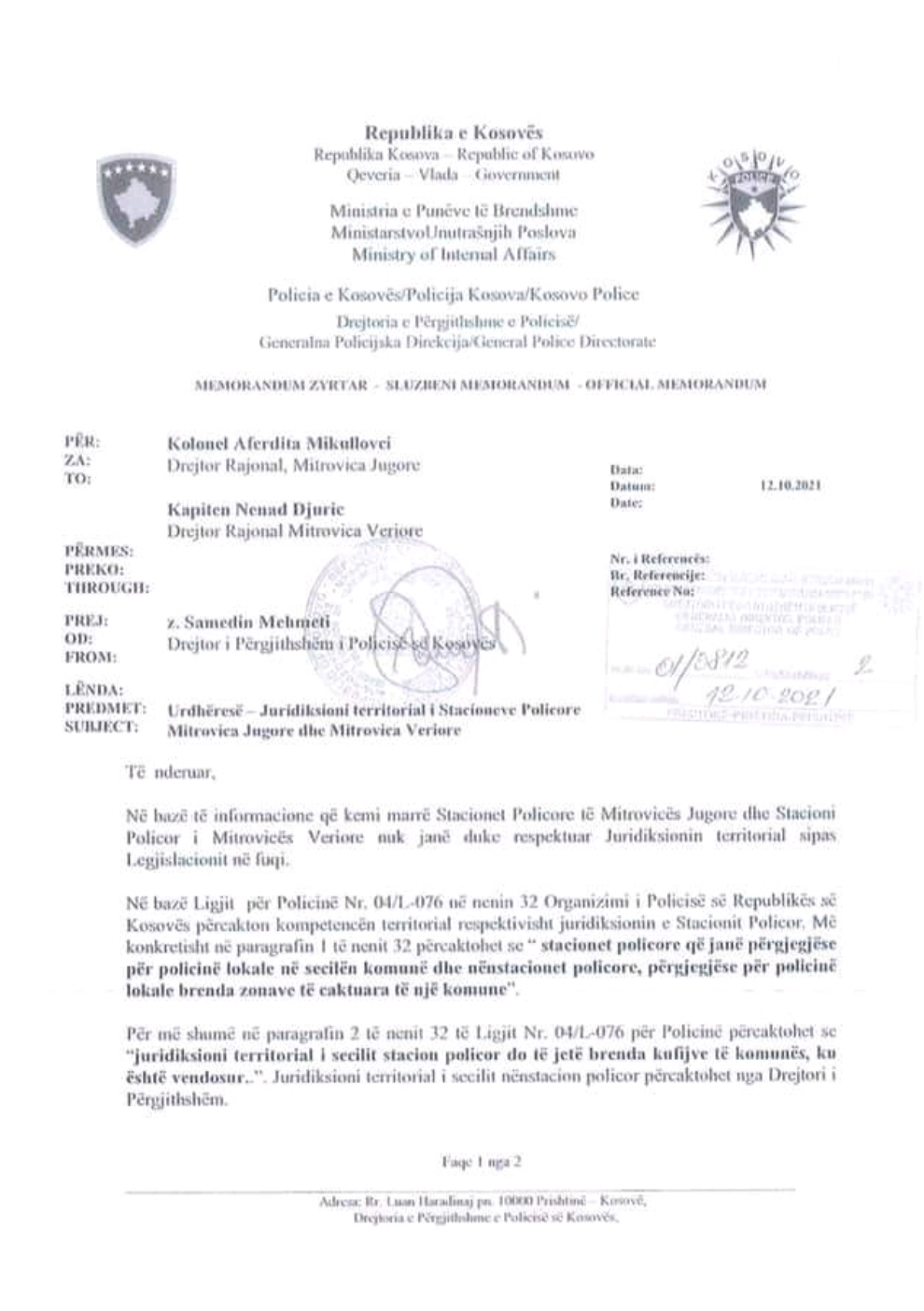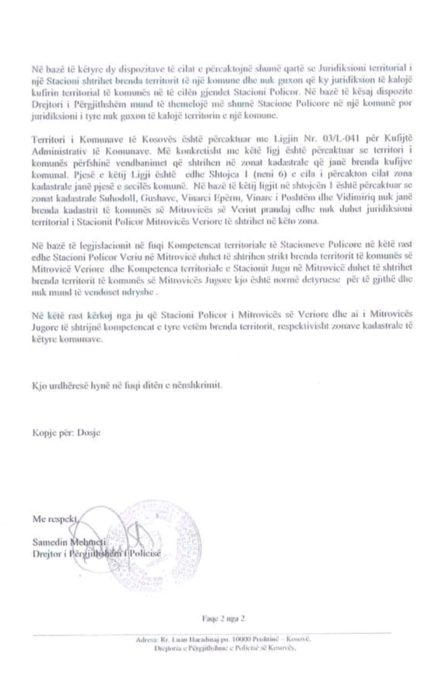“Pas kërkesës së Kryetarit të Komunës së Mitrovicës z. Agim Bahtiri, kërkesës së banorëve të Suhodollit pas vizitës sime atje si dhe rishikimit të hartave kadastrale të Komunës së Mitrovicës, zonat kadastrale Suhodoll, Gushavc, Vinarc i Epërm, Vinarc i Poshtëm dhe Vidimiriq kalojnë nga menaxhimi dhe përgjegjësia e Stacionit Policor të Mitrovicës Veriore në atë Jugore.