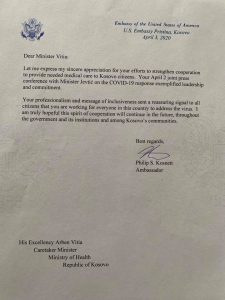 Letër falenderimi nga Ambasada e Shteteve të Bashkuara të Amerikës në Kosovë. Duke iu falenderuar të gjithë profesionistëve shëndetësorë dhe punëtorëve mbështetës, zyrtarëve policorë, kryetarëve të Komunave të Republikës së Kosovës, zyrtarëve komunal, ministrave dhe partnerëve nga BE e SHBA ne jemi duke u përpjekur të parandalojmë shpërndarjen e virusit.