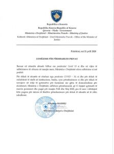 “Ministrja Haxhiu udhëzon përmbaruesit privat që të mos debitojnë pagat dhe pensionet e qytetarëve për muajin prill dhe maj për shkak të situatës me pandeminë Covid-19”, thuhet në njoftim.