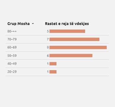 Sipas të dhënave nga MSH, 5 raste të vdekjes janë nga grup mosha 80+, 7 nga 70-79, 8 nga 60-69, 6 nga 50-59, 1 nga 40-49 dhe 1 nga 20-29.