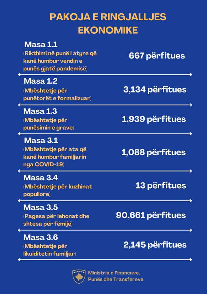 Ministri i Financave, Hekuran Murati ka publikuar disa statistika të këtij muaji të disa prej atyre që kanë përfituar prej masave nga Pakoja e Ringjalljes Ekonomike.