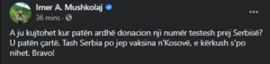 “A ju kujtohet kur patën ardhë donacion nji numër testesh prej Serbisë? U patën çartë. Tash Serbia po jep vaksina n’Kosovë, e kërkush s’po nihet. Bravo!”, ka shkruar ai.