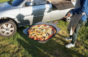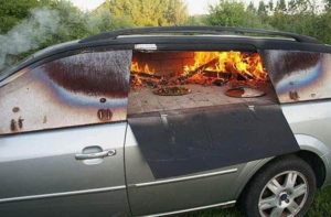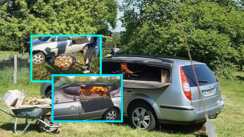 Ky person, ka marr një veturë të tipit Ford, dhe e ka kthyer në një furrë për të pjekur pica. Ashtu siç shihet në fotot më poshtë, ai i ka hequr një pjesë veturës dhe e ka rregulluar ashtu që ka vendosur drunjtë, prushin dhe po pjekë pica pa problem.