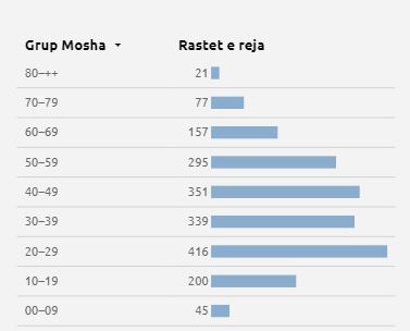 200 të infektuar janë të moshës 10-19 vjeçare, 416 janë të moshës 20-29 vjeçare, 339 janë të moshës 30-39 vjeçare, 351 të moshës 40-49 vjeçare, 295 të moshës 50-59 vjeçare, 157 të moshës 60-69 vjeçare, 77 të moshës 70-79 vjeçare dhe 21 mbi 80 vjeç.