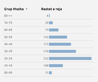 Të dhënat e Ministrisë së Shëndetësisë dhe Institutit Kombëtar të Shëndetit Publik tregojnë se 332 të infektuar janë të moshës 20-29 vjeçare, 210 të moshës 30-39 vjeçare, 173 të moshës 40-49 vjeçare, 142 janë të moshës 50-59 vjeçare, 74 të moshës 60-69 vjeçare, 29 të moshës 70-70 vjeçare ndërsa 6 persona janë mbi 80 vjeç.