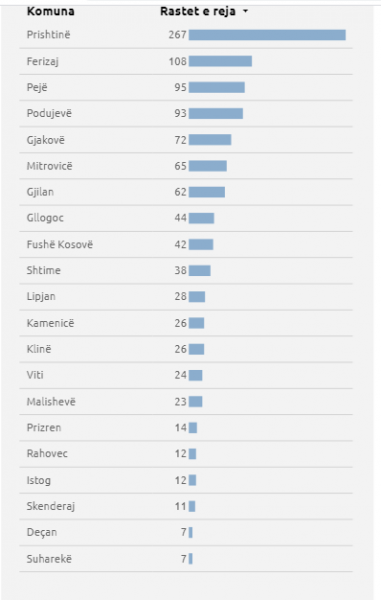 Numër më të madh të rasteve të reja të infektuara me koronavirus ka raportuar Prishtina, gjithsej 267, pastaj Ferizaj 108 raste, Peja 95, Podujeva 93 dhe Gjakova 72.