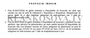 Burime të larta zyrtare të Klan Kosovës bëjnë me dije se nga 30 korriku, 2020 të gjithështetasit e Republikës së Kosovës që vijnë nga vendet me risk të lartë të infeksionit (Republika e Shqipërisë, Maqedonisë së veriut, Malit të zi dhe Serbisë) obligohen të vetë-izolohen për 7 ditë në shtëpitë/banesat e tyre.