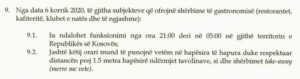 Përveç që këto ndërmarrje do të mbyllen tërësisht nga ora 21:00 deri në orën 05:00, ato s’do të mund të punojnë në hapësira të mbyllura as jashtë këtij orari. “Nga data 6 korrik 2020, të gjitha subjekteve që ofrojnë shërbime të gastronomisë (restorantet, kafiteritë, klubet e natës dhe të ngjashme): Iu ndalohet funksionimi nga ora 21:00 deri në 05:00 në të gjithë territorin e Republikës së Kosovës; Jashtë këtij orari mund të punojnë vetëm në hapësira të hapura duke respektuar distancën prej 1.5 metrash hapësirë ndërmjet tavolinave, si dhe shërbimet take-away (merre me vete)“, thuhet në pikën 9 të vendimit të qeverisë.