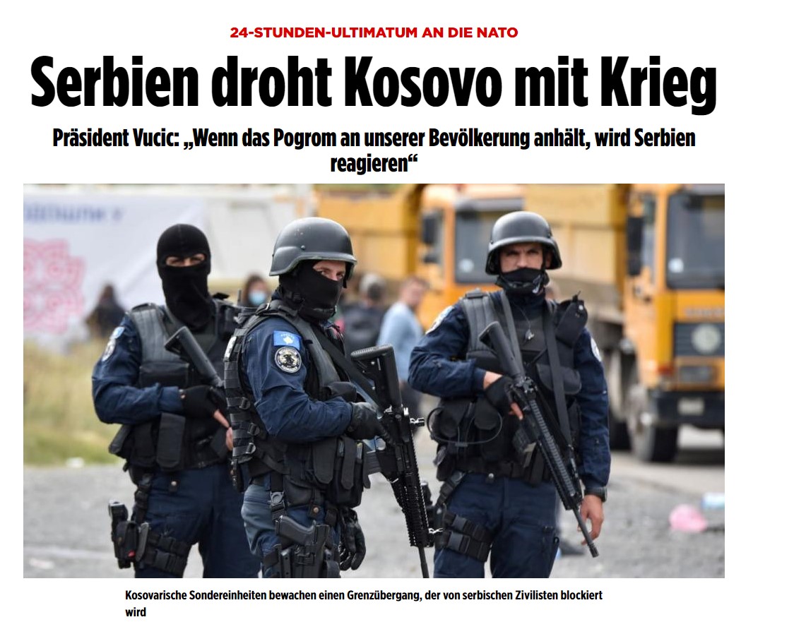 Në faqen e parë të Bild shkruhet: “Serbia e kërcënon Kosovën me luftë, ultimatum 24-orësh për NATO-n”.