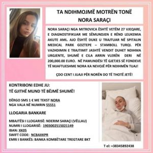 Familjarët e Nora Saraçit kanë kërkuar ndihmë financiare nga qytetarët për shërimin e vajzës së tyre, e cila vuan nga sëmundja leukemia akute.