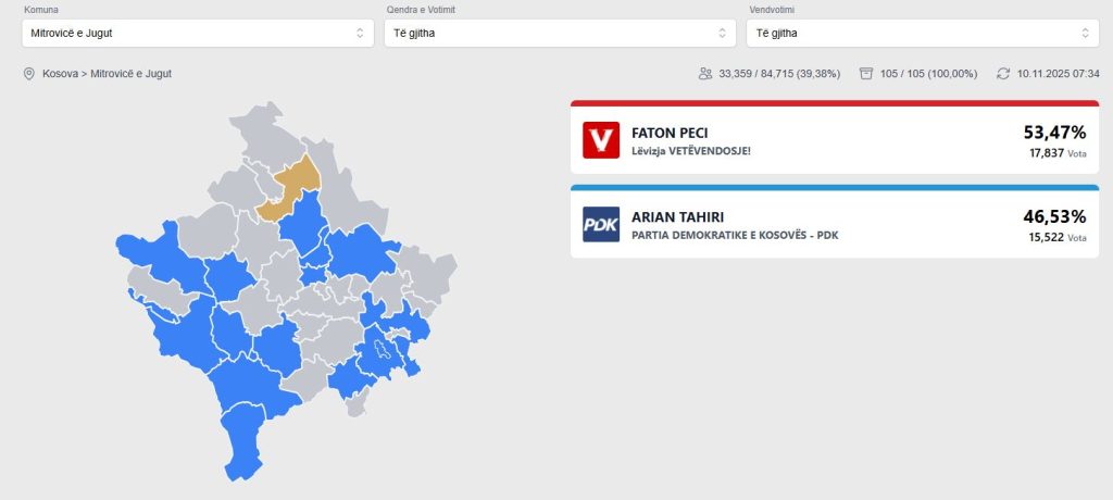 Numërohen 100% të votave në Mitrovicën e Jugut, Faton Peci kryetar