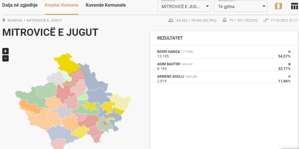 Nga numërimi i më shumë se gjysmës së votave, Bedri Hamza prinë me 54.57% të votave, i pasuar nga kandidati i LVV dhe kryetari aktual, Agim Bahtiri me 33.77%.