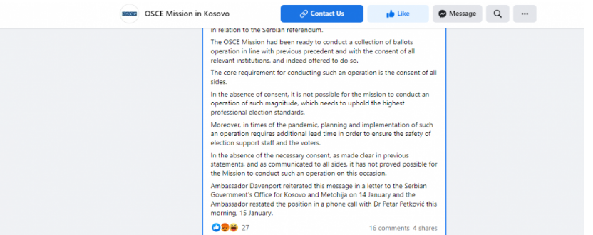 Misioni i OSBE-së në Kosovë përmes një deklaratë të lëshuar sot gjatë ditës kanë njoftuar se nuk do të mund të organizojnë procesin e mbledhjes së votave për referendumin e Serbisë, meqë për një gjë të tillë s’ka pajtueshmëri të të gjitha palëve dhe se situatën më të vështirë e bën edhe pandemia.