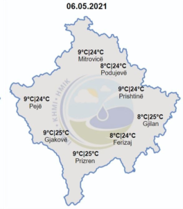 “Temperaturat minimale do të lëvizin ndërmjet 8-9 gradë Celsius, ndërsa maksimalet e ditës parashihen të lëvizin ndërmjet 20-24 gradë Celsius. Do të fryjë erë kryesisht nga jugperëndimi me shpejtësi 1-9m/s”, thuhet në njoftimin e IHMK-së./Gazeta Sinjali/