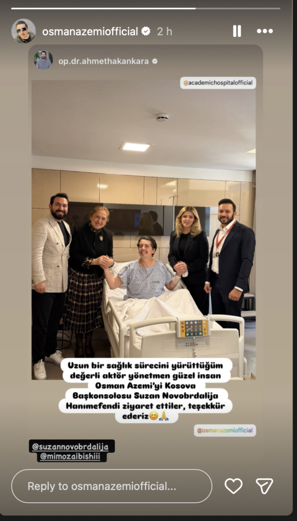 Ai ka ndarë me publikun një moment nga spitali, ku ai është vizituar nga Konsullja e Përgjithshme e Kosovës në Stamboll, Suzan Novobërdaliu, e shoqëruar nga stafi tjetër.