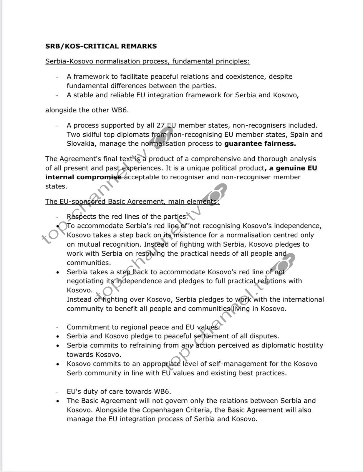 Teksti përfundimtar i Marrëveshjes është produkt i një analize gjithëpërfshirëse dhe të plotë të të gjitha përvojave të tanishme dhe të kaluara. Është një produkt unik politik, një kompromis i vërtetë i brendshëm i Bashkimit Europian, i pranueshëm për të njohur dhe mosnjohur shtetet anëtare. Elementet kryesore të Marrëveshjes Themelore të sponsorizuar nga BE janë Respektimi i vijave të kuqe të palëve. Për të përshtatur vijën e kuqe të Serbisë për mosnjohjen e pavarësisë së Kosovës, Kosova bën një hap prapa në këmbënguljen e saj për një normalizim të përqendruar vetëm në njohjen reciproke. Në vend që të luftojë me Serbinë, Kosova zotohet të punojë me Serbinë për zgjidhjen e nevojave praktike të të gjithë njerëzve dhe komuniteteve.