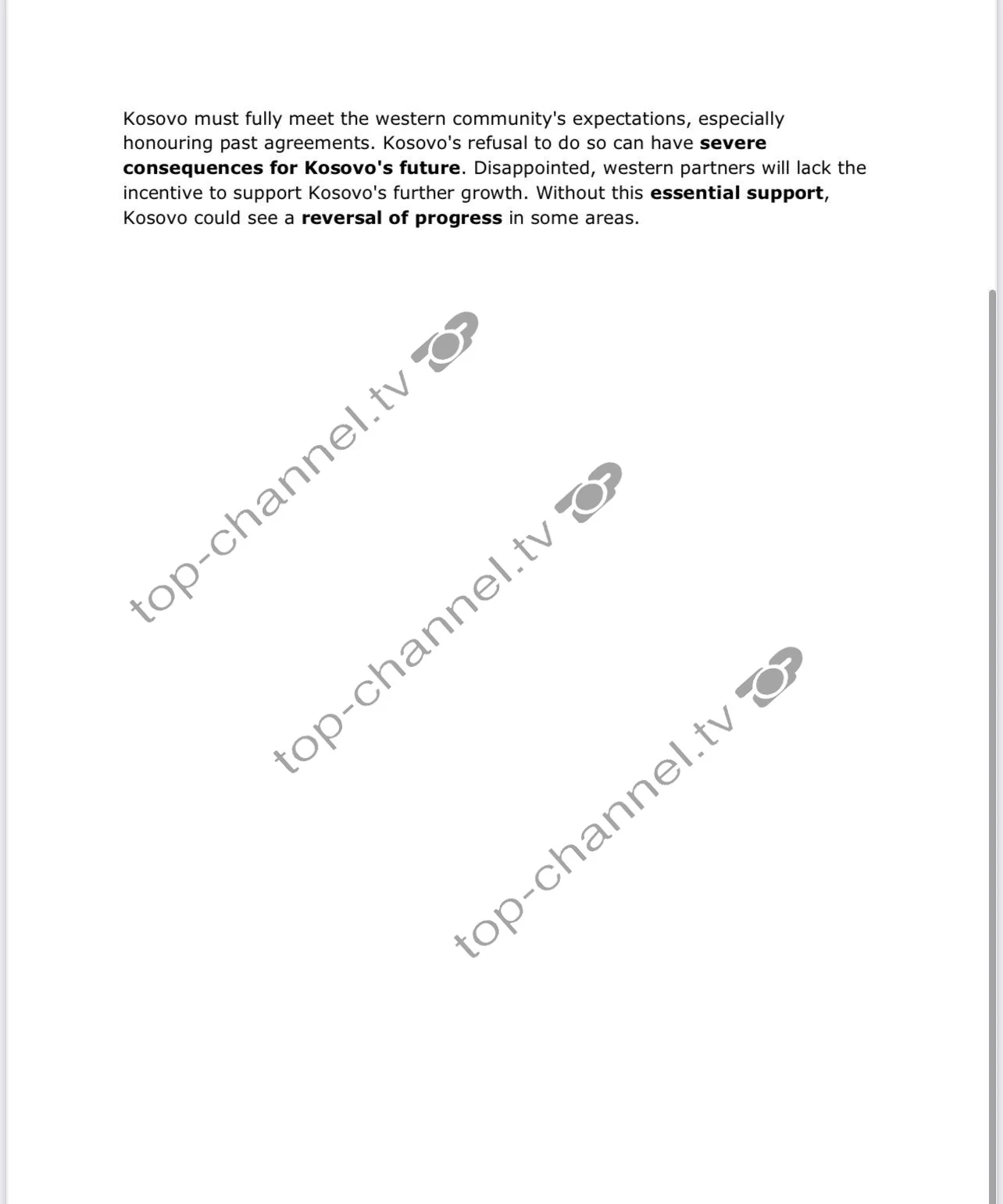 Kosova duhet të përmbushë plotësisht pritjet e komunitetit perëndimor, veçanërisht duke respektuar marrëveshjet e kaluara. Refuzimi i Kosovës për ta bërë këtë mund të ketë pasoja të rënda për të ardhmen e Kosovës. Të zhgënjyer, partnerëve perëndimorë do t’u mungojë nxitja për të mbështetur rritjen e mëtejshme të Kosovës. Pa këtë mbështetje thelbësore, Kosova mund të shohë një përmbysje të progresit në disa fusha.